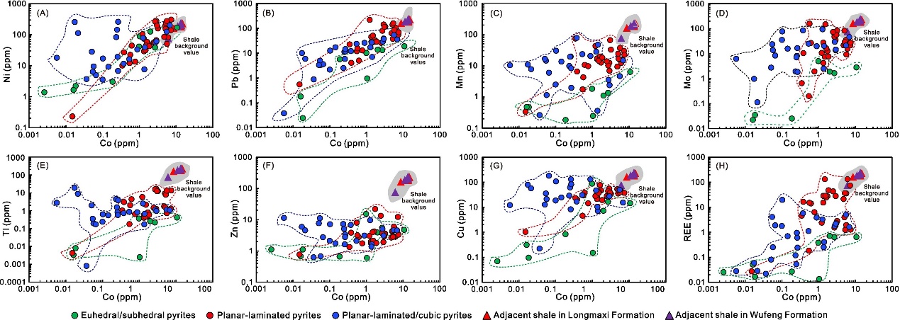 本项目选取四川盆地东缘奥陶系五峰组/志留系龙马溪组富有机质页岩层系 为研究对象,利用微区原位微量元素及硫同位素分析方法,揭示了页岩层系中的热液流体循环 (图1)。作者根据微量元素含量及其比值、硫同位素组成以及矿物交切关系等特征,发现研究区五峰组-龙马溪组页岩中存在一类热液成因的黄铁矿。有趣的是,尽管黄铁矿常常被认为是沉积岩中重要的“微量金属元素储库”,而本研究区中黄铁矿的微量金属元素含量往往低于其围岩 (图2),暗示该地区其它矿物相/有机相在储存微量金属元素方面很可能具备了更强的能力 (例如干酪根等)。这个现象有可能为进一步分析微量金属元素在富有机质页岩中各相之间的分配规律提供一定的参考。