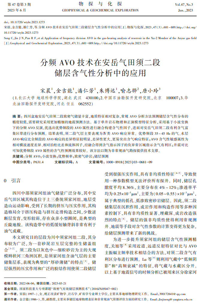 2138cn太阳集团硕士生宋晨在地球物理领域期刊《物探与化探》期刊发表题为“分频AVO技术在安岳气田须二段储层含气性分析中的应用”的研究论文。长江大学2138cn太阳集团为论文第一署名单位,硕士生宋晨为论文第一作者,金吉能副教授为通讯作者。