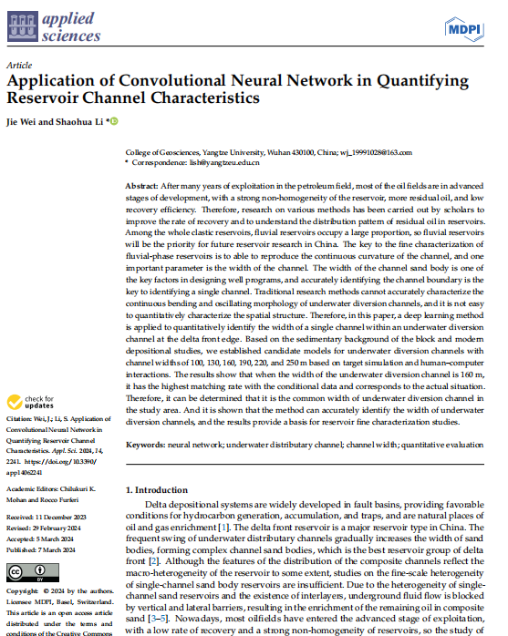 2138cn太阳集团硕士生卫洁在期刊《Applied sciences》上发表了题为“Application of Convolutional Neural Network in Quantifying Reservoir Channel Characteristics”的研究论文。长江大学2138cn太阳集团为论文第一署名单位,卫洁为第一作者,其导师李少华教授为该文通讯作者。