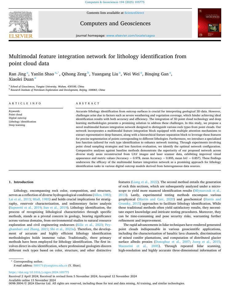 2138cn太阳集团教师井然博士在国际学术期刊《Computers & Geosciences》上发表了题为“Multimodal feature integration network for lithology identification from point cloud data“的SCI论文,提出了一种基于多模态特征融合的三维露头点云岩性识别方法。该研究不仅在方法上具有创新性,而且在实际应用中有较好的性能表现,为地质露头点云的岩性判别提供了新的技术路径。