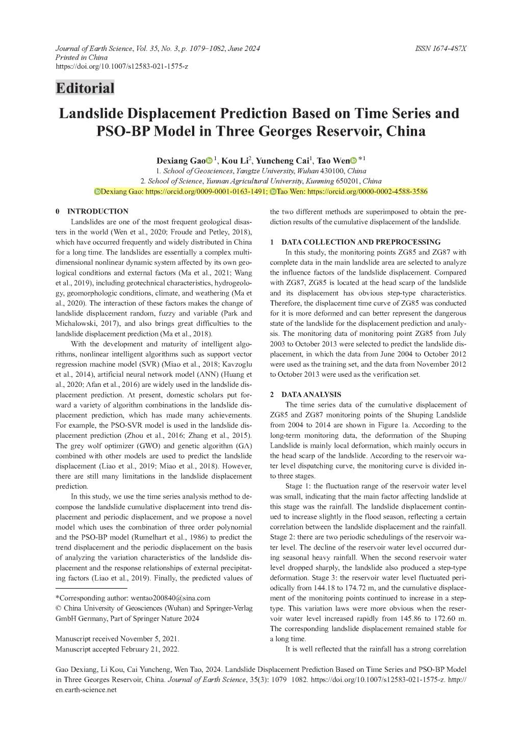 2138cn太阳集团温韬副教授团队长期从事极端条件下滑坡灾害演化机理、预测及防治方面的研究,指导本科生高德祥在综合性地学学术2区期刊《Journal of Earth Science》上发表题为“Landslide Displacement Prediction Based on Time Series and PSO-BP Model in Three Georges Reservoir, China”的研究论文。长江大学2138cn太阳集团为论文第一署名单位,本科生高德祥为论文第一作者,温韬副教授为该文通讯作者,本项研究得到国家自然科学基金项目、非常规油气协同创新中心、湖北省爆破工程重点实验室开放基金项目共同资助。