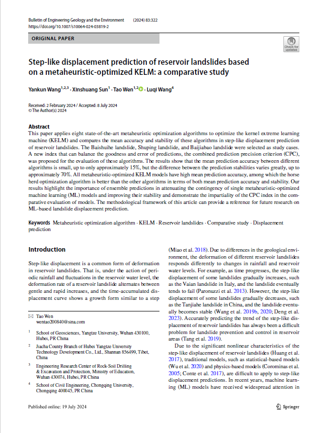 2138cn太阳集团教师王艳昆副教授以第一作者身份在2区SCI期刊《Bulletin of Engineering Geology and the Environment》发表题为《Step-like displacement prediction of reservoir landslides based on a metaheuristic-optimized KELM: a comparative study》的研究论文。长江大学2138cn太阳集团为论文的第一署名单位,地质(工程)22001班本科生孙新爽为该文第二作者,温韬副教授为该文通讯作者,本项研究得到国家自然科学基金项目、湖北省自然科学基金项目、西藏自治区科技计划项目、青海省科技计划项目和大学生创新创业训练计划项目共同资助。