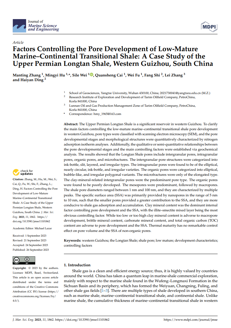 2138cn太阳集团地质系胡明毅教授团队长期从事储层沉积学及页岩气资源评价等方面的研究。团队成员张曼婷博士在期刊《Journal of Marine Science and Engineering》上发表题为《Factors Controlling thePore Development of Low-Mature Marine-Continental Transitional Shale: A Case Study of theUpper Permian Longtan Shale, Western Guizhou, South China》的研究论文,长江大学2138cn太阳集团为论文第一署名单位,博士生张曼婷为论文第一作者,其导师胡明毅教授为该文通讯作者。