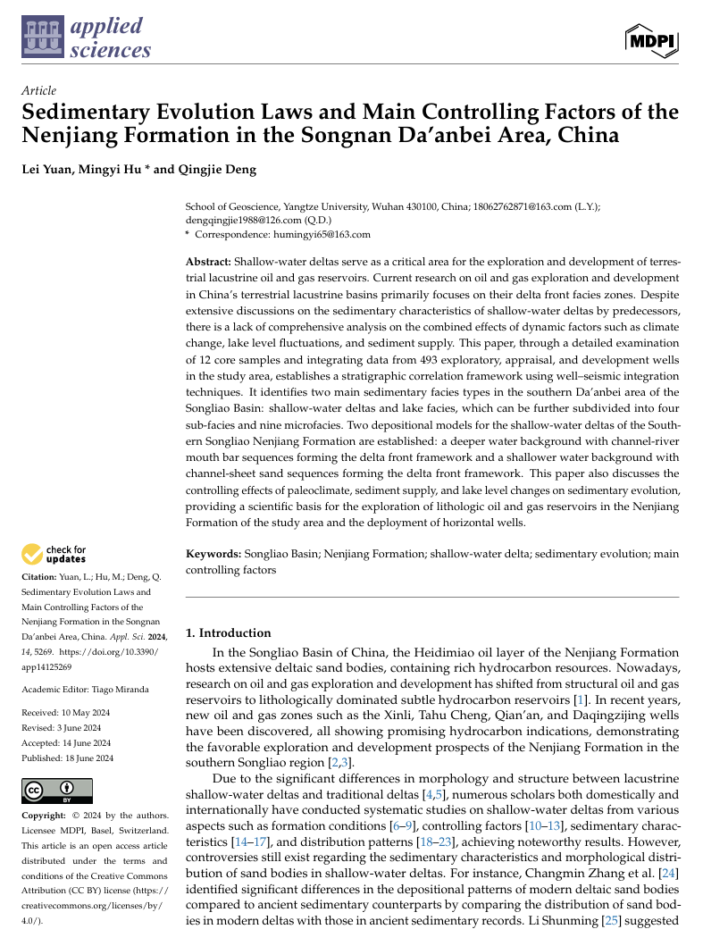 2138cn太阳集团硕士生袁磊在期刊《Applied sciences》上发表了题为“Sedimentary Evolution Laws and Main Controlling Factors of theNenjiangFormation in theSongnanDa’anbeiArea, China”的研究论文。长江大学2138cn太阳集团为论文第一署名单位,袁磊为第一作者,其导师胡明毅教授为该文通讯作者。