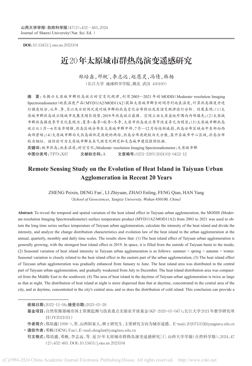 2138cn太阳集团硕士生郑培鑫在北大核心期刊《山西大学学报》(自然科学版)发表题目为“近20年太原城市群热岛演变遥感研究”的研究论文。长江大学2138cn太阳集团为论文第一署名单位,硕士研究生郑培鑫为论文第一作者,其导师邓帆为论文通讯作者。