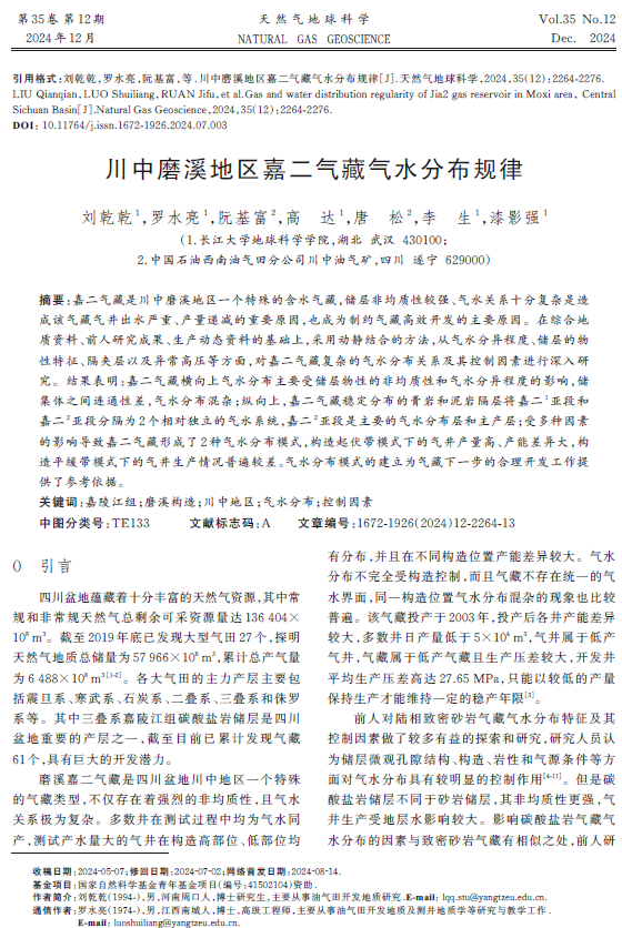 2138cn太阳集团石油系博士生刘乾乾同学在2138cn太阳集团罗水亮副教授的指导下,在《天然气地球科学》上发表题为“川中磨溪地区嘉二气藏气水分布规律”的研究论文。