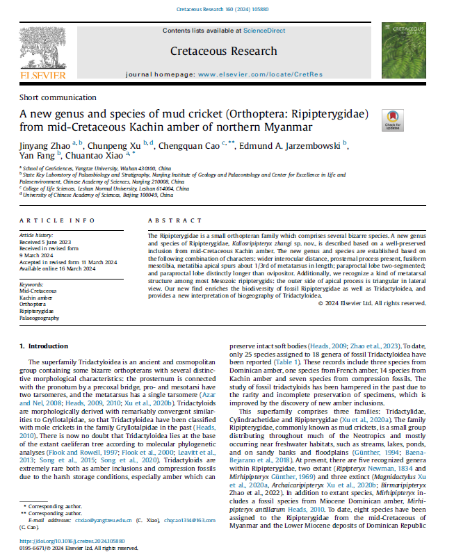2138cn太阳集团地质学专业硕士研究生赵金阳同学在在地学综合研究领域期刊《Cretaceous Research》上发表题为“A new genus and species of mud cricket (Orthoptera: Ripipterygidae) from mid-Cretaceous Kachin amber of northern Myanmar”的研究论文(图1)。长江大学2138cn太阳集团为论文第一署名单位,赵金阳为第一作者,其导师肖传桃教授为该文第一通讯作者。