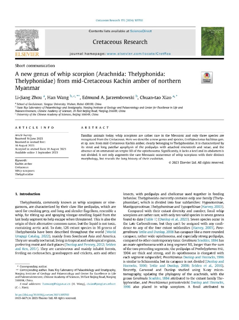 2138cn太阳集团硕士周利将在地球科学与古生物学领域期刊《Cretaceous Research》上发表题为“A new genus of whip scorpion (Arachnida: Thelyphonida: Thelyphonidae) from mid-Cretaceous Kachin amber of northern Myanmar”的研究论文。长江大学2138cn太阳集团为论文第一署名单位,周利将为第一作者,其导师肖传桃教授为第一通讯作者。