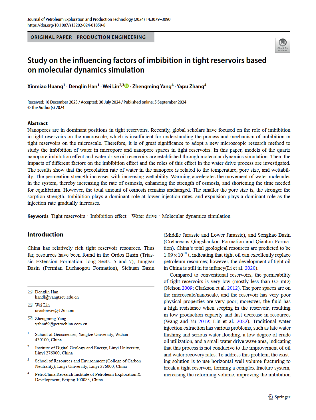 2138cn太阳集团硕士研究生章黄鑫淼在《Journal of Petroleum Exploration and Production Technology》发表了题为“Study on the influencing factors of imbibition in tight reservoirs based on molecular dynamics simulation”的研究论文,长江大学2138cn太阳集团为论文第一署名单位,黄鑫淼为论文第一作者,韩登林教授、林伟老师、杨正明老师共同为该文通讯作者。