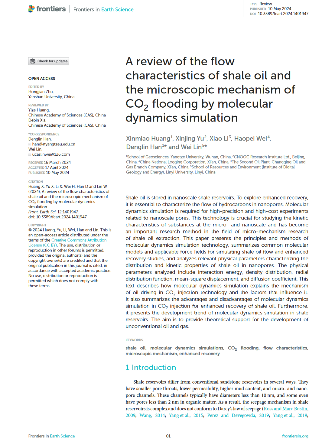2138cn太阳集团硕士研究生黄鑫淼在《Frontiers in Earth Science》发表了题为“A review of the flow characteristics of shale oil and the microscopic mechanism of CO2 flooding by molecular dynamics simulation”的综述论文,长江大学2138cn太阳集团为论文第一署名单位,黄鑫淼为论文第一作者,韩登林教授、林伟老师共同为该文通讯作者。