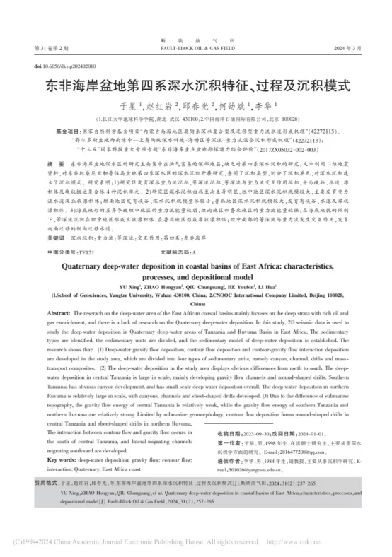 2138cn太阳集团硕士生于星在《断块油气田》发表题为“东非海岸盆地第四系深水沉积特征、过程及沉积模式”的研究论文。长江大学2138cn太阳集团为论文第一署名单位,硕士生于星为论文第一作者,教师李华为通讯作者。