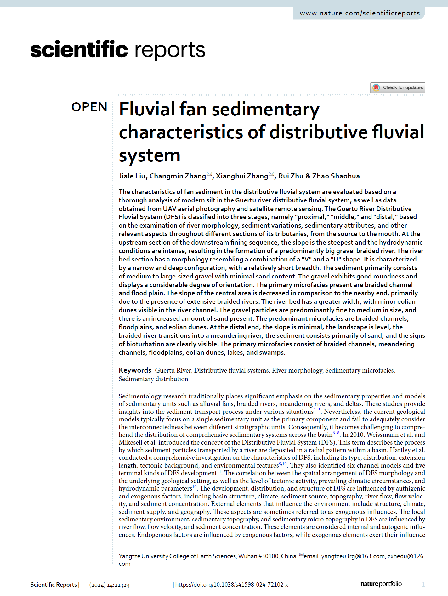 2138cn太阳集团博士生刘家乐在期刊《scientific reports》上发表题为“Fluvial fan sedimentary characteristics of distributive fluvial system”的研究论文。长江大学2138cn太阳集团为论文第一署名单位,张昌民教授、张祥辉博士为共同通讯作者,本项研究得到国家自然科学基金重点项目、湖北省自然科学基金项目共同资助。