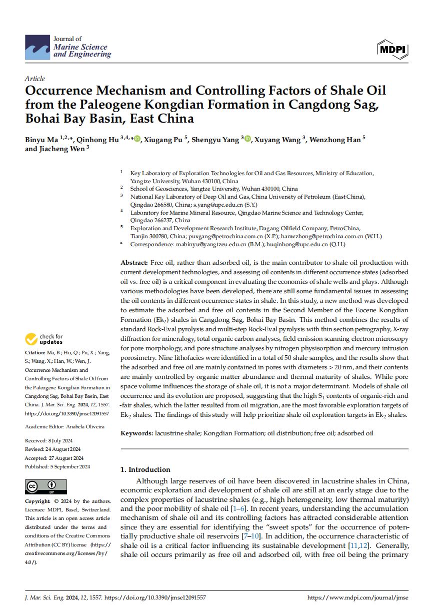 2138cn太阳集团地质系马斌玉博士以第一作者身份在海洋地质学领域主流期刊《Journal of Marine Science and Engineering》(JMSE)上发表题为“Occurrence Mechanism and Controlling Factors of Shale Oilfrom the Paleogene Kongdian Formation in Cangdong Sag,Bohai Bay Basin, East China”的研究论文,该项研究得到了国家自然科学基金、中国博士后基金和油气资源与勘探技术教育部重点实验室开放基金的资助。