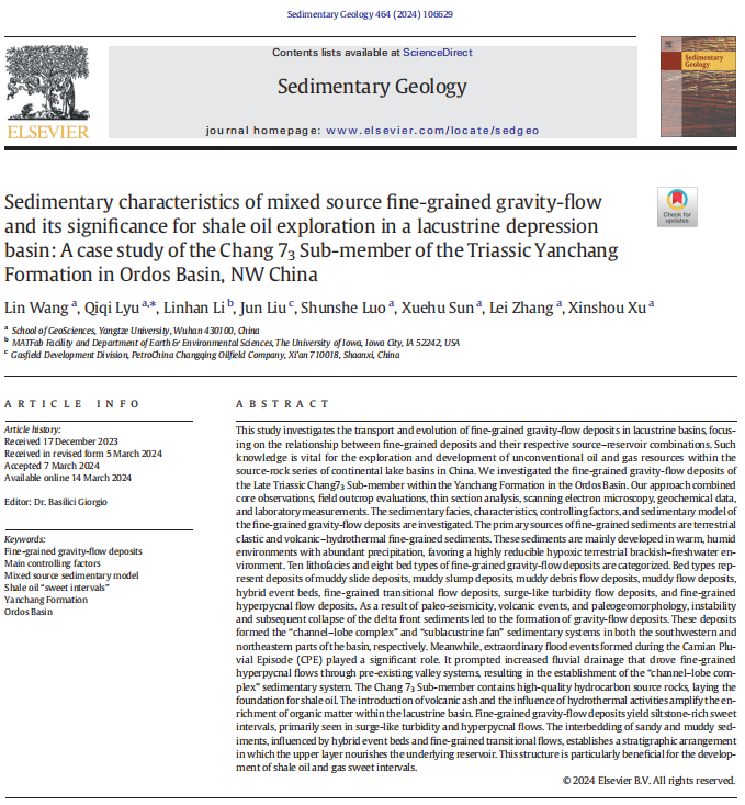 2138cn太阳集团硕士生王林在《Sedimentary Geology》发表题为“Sedimentary characteristics of mixed source fine-grained gravity-flow and its significance for shale oil exploration in a lacustrine depression basin: A case study of the Chang 73Sub-member of the Triassic Yanchang Formation in Ordos Basin, NW China”的研究论文。长江大学2138cn太阳集团为论文第一署名单位,硕士生王林为论文第一作者,教师吕奇奇为通讯作者。