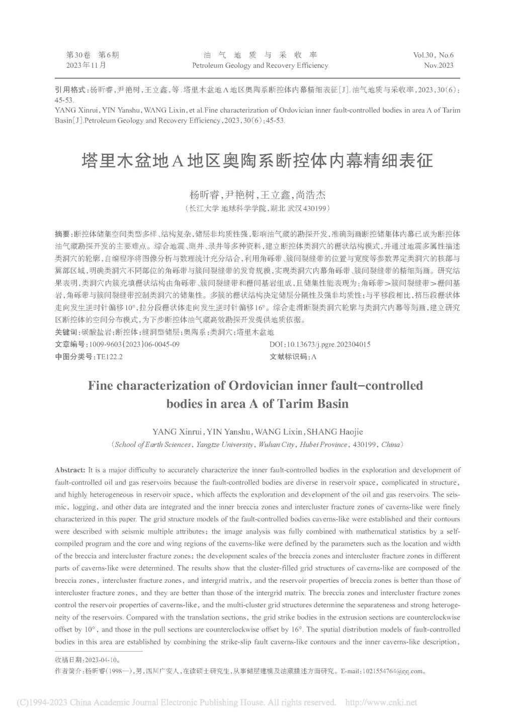 2138cn太阳集团地质学研究生杨昕睿在《油气地质与采收》上发表了题为“塔里木盆地A地区奥陶系断控体内幕精细表征”的研究论文。
