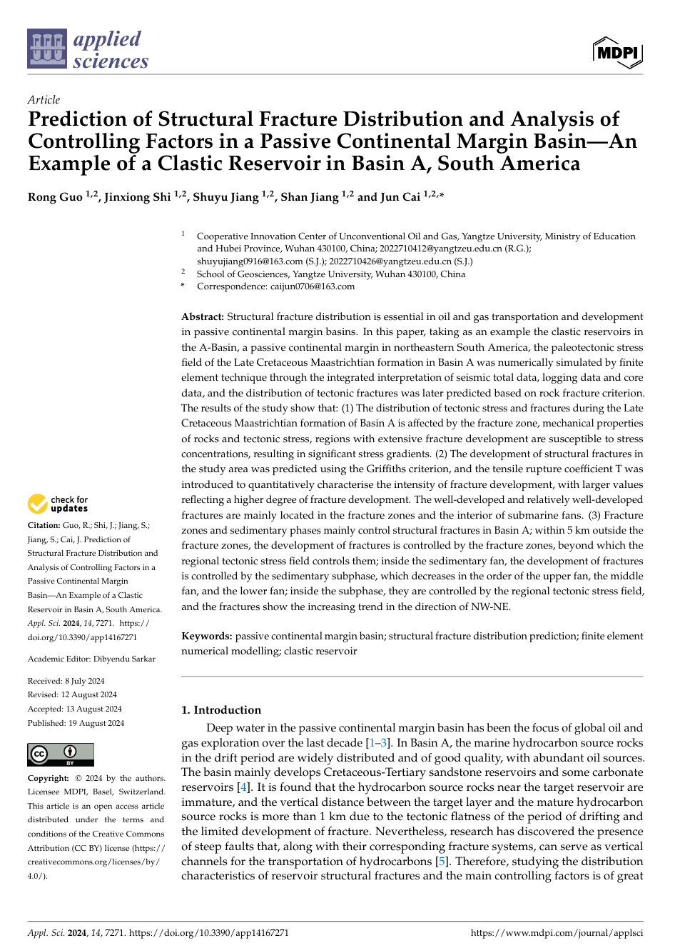 2138cn太阳集团硕士研究生郭蓉在《applied sciences》上发表题目为“Prediction of Structural Fracture Distribution and Analysis of Controlling Factors in a Passive Continental Margin Basin—An Example of a Clastic Reservoir in Basin A, South America”的研究论文。该研究通过采用有限元构造数值模拟技术,探讨了被动陆缘盆地的古构造应力场及其裂缝分布特征。研究结果表明被动陆缘盆地先存断裂区域容易出现应力集中,有利于裂缝发育,有效控制距离可达5公里;较大的伸展破裂系数表明被动陆缘海底扇内部也是裂缝发育的优势指向区,发育强度的差异受控于岩石力学参数的变化。