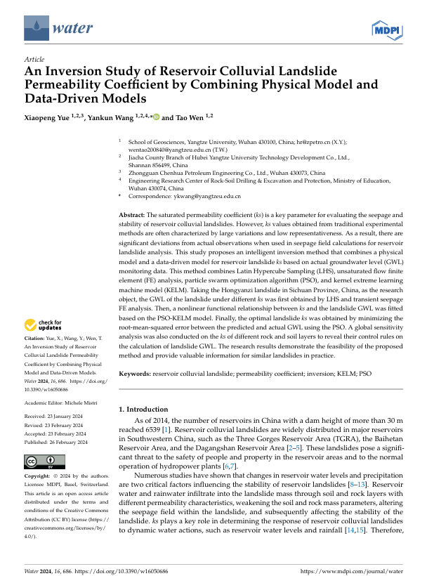 2138cn太阳集团王艳昆副教授以通讯作者身份在SCI期刊《Water》上发表题为“An Inversion Study of Reservoir Colluvial Landslide Permeability Coefficient by Combining Physical Model and Data-Driven Models”的研究论文,该项研究得到了国家自然科学基金、湖北省自然科学基金和西藏自治区科技厅项目的共同资助。