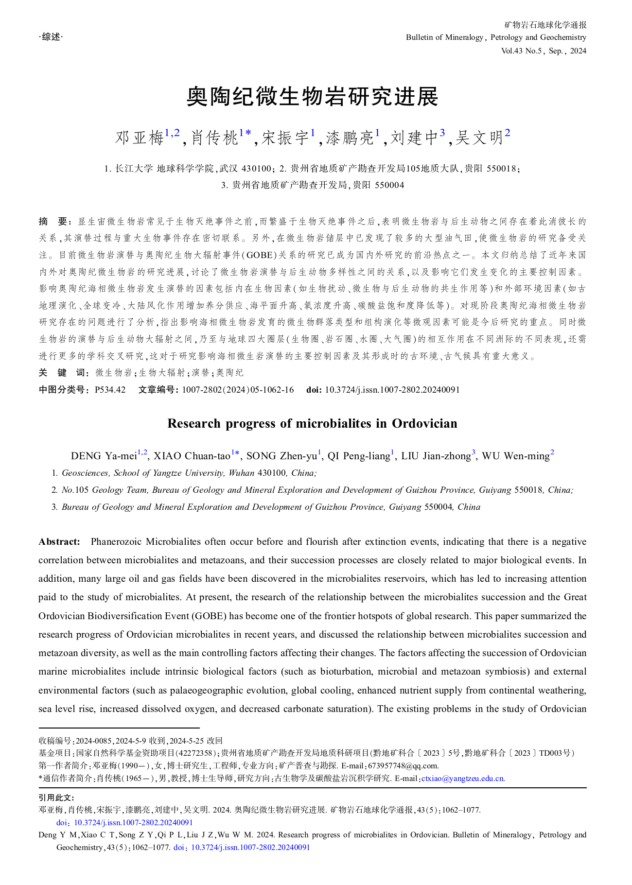 2138cn太阳集团矿产普查与勘探专业博士研究生邓亚梅同学在2138cn太阳集团肖传桃教授的指导下,在地球科学与地质学领域期刊《矿物岩石地球化学通报》上发表题为“奥陶纪微生物岩研究进展”的研究论文。