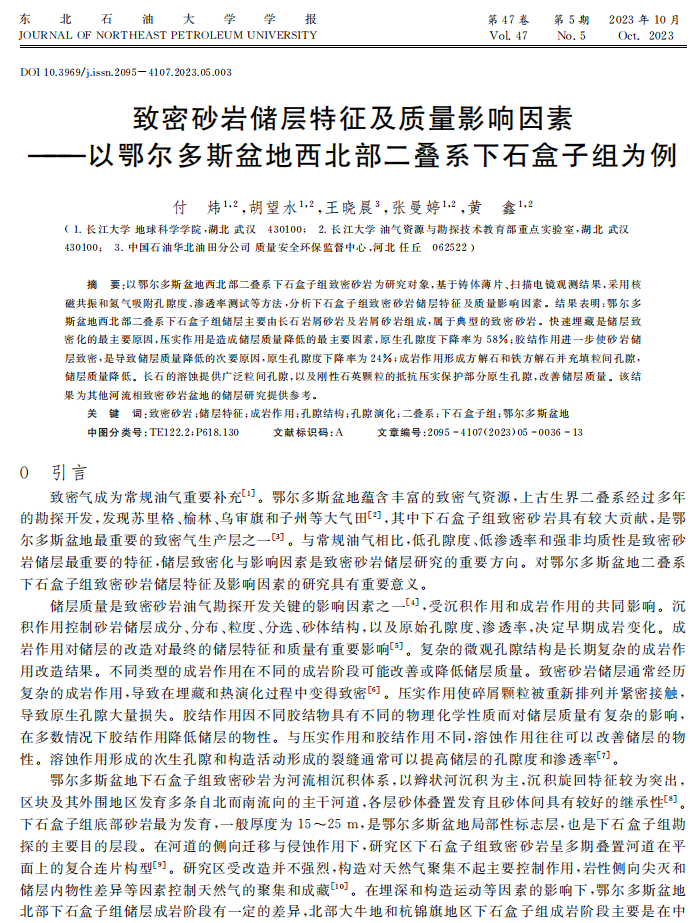 2138cn太阳集团博士生付炜在期刊《东北石油大学学报》上发表题为“致密砂岩储层特征及质量影响因素———以鄂尔多斯盆地西北部二叠系下石盒子组为例”的研究论文。长江大学2138cn太阳集团为论文第一署名单位,胡望水教授为通讯作者,本项研究得到国家自然科学基金重点项目项目资助。