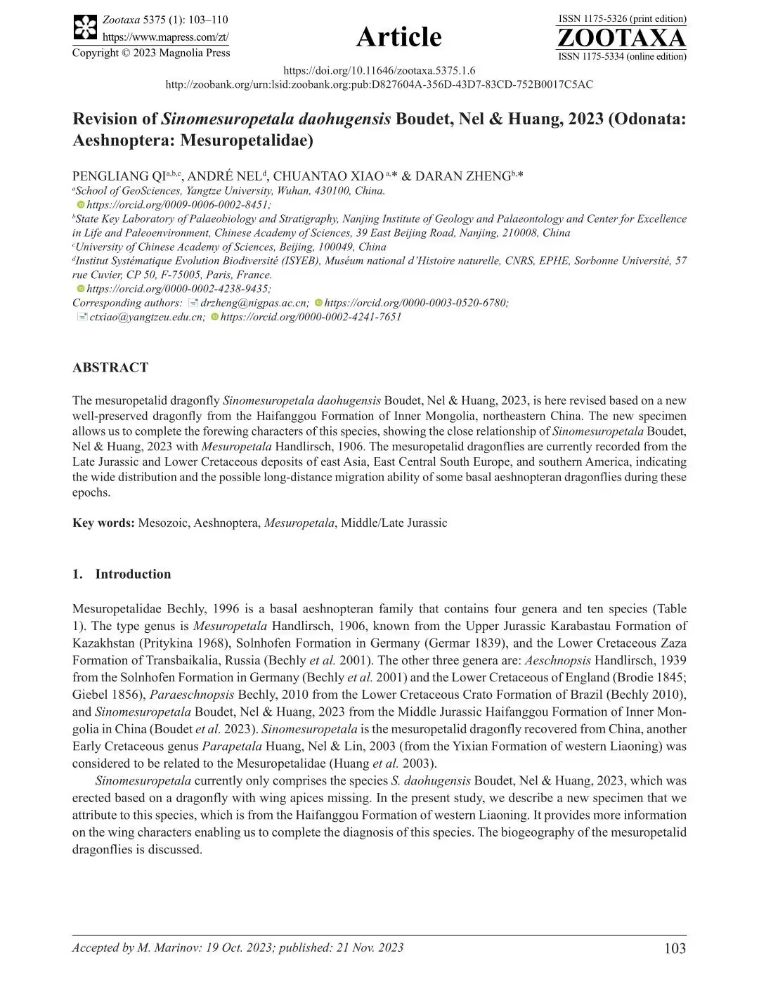 2138cn太阳集团地质资源与地质工程专业硕士生漆鹏亮在古生物学期刊《ZOOTAXA》上发表题为“Revision of Sinomesuropetala daohugensis Boudet, Nel & Huang, 2023 (Odonata:Aeshnoptera: Mesuropetalidae)”的研究论文。长江大学2138cn太阳集团为论文第一署名单位,漆鹏亮为第一作者,其导师肖传桃教授为第一通讯作者。