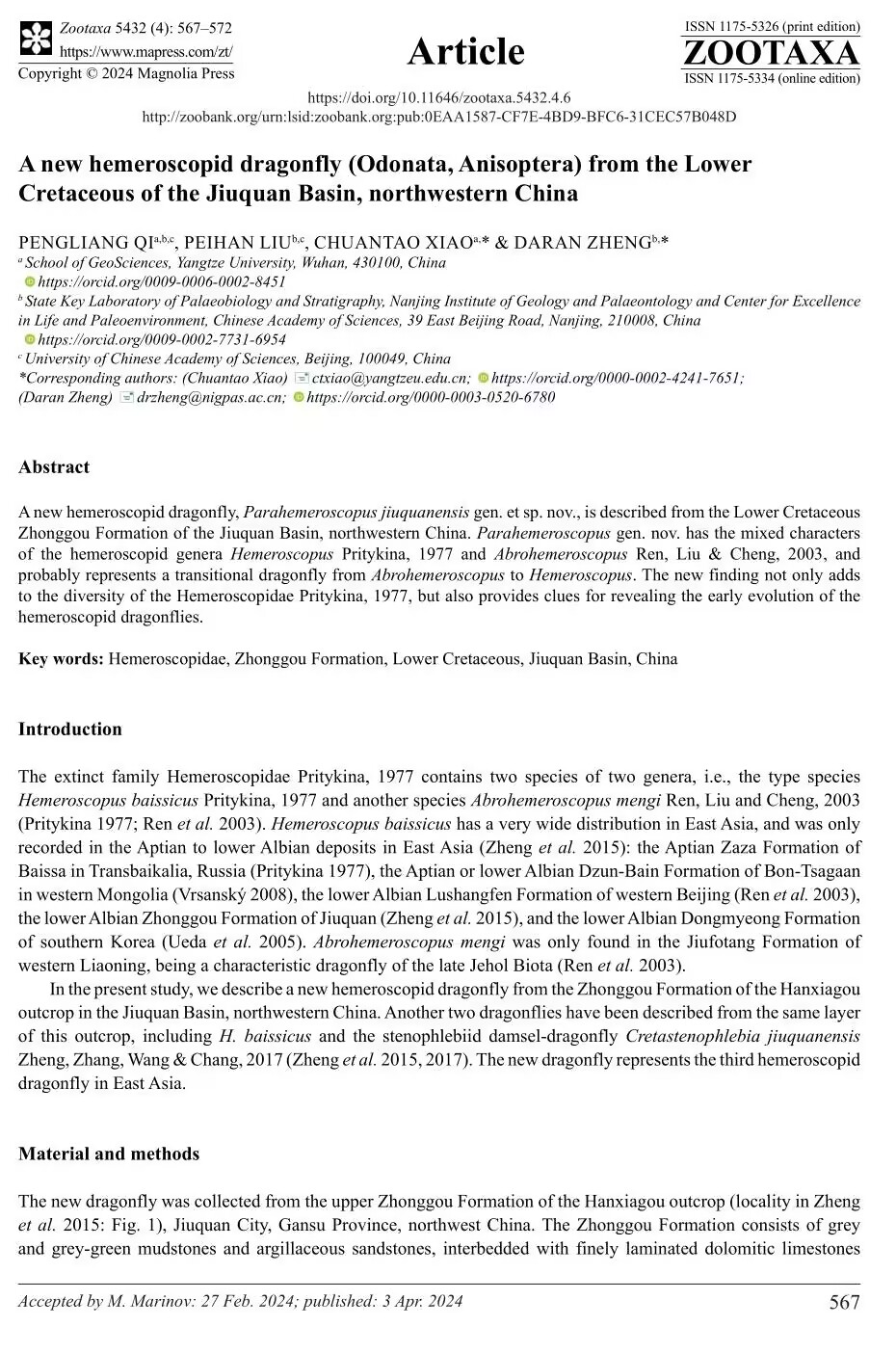 2138cn太阳集团地质资源与地质工程专业硕士生漆鹏亮在在古生物学期刊《ZOOTAXA》上发表题为“A new hemeroscopid dragonfly (Odonata, Anisoptera) from the Lower Cretaceous of the Jiuquan Basin, northwestern China”的研究论文。长江大学2138cn太阳集团为论文第一署名单位,漆鹏亮为第一作者,其导师肖传桃教授为第一通讯作者。