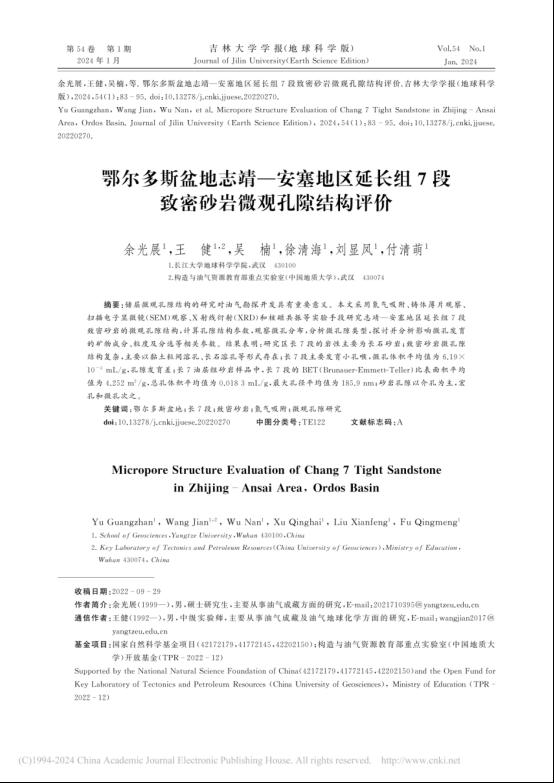 2138cn太阳集团硕士生余光展在《吉林大学学报(地球科学版)》上发表题为“鄂尔多斯盆地志靖—安塞地区延长组7段致密砂岩微观孔隙结构评价”的研究论文。长江大学2138cn太阳集团为论文第一署名单位,硕士生余光展为论文第一作者,教师王健为通讯作者。