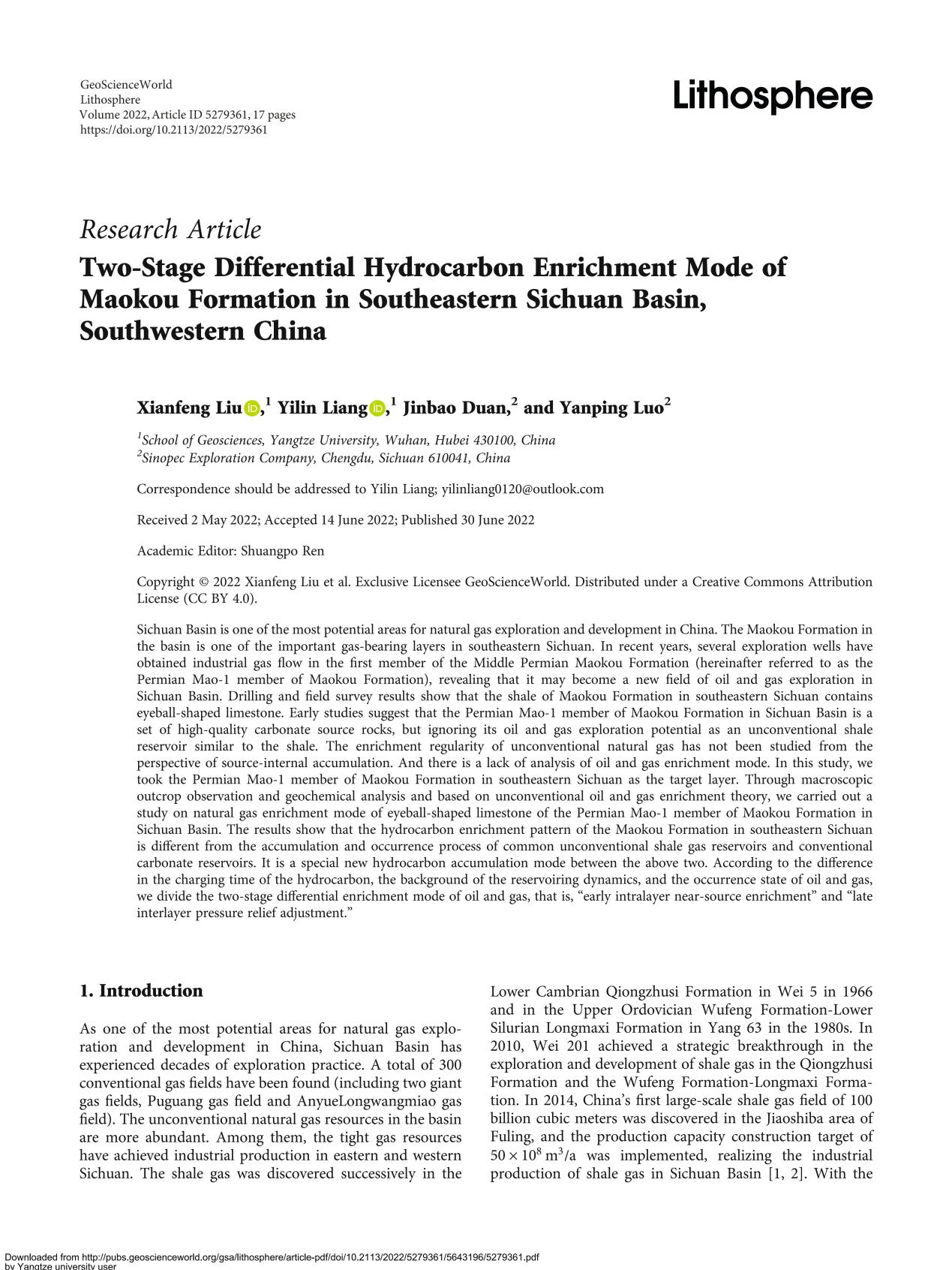 2138cn太阳集团教师刘显凤在《LITHOSPHERE》上发表题为“Two-Stage Differential Hydrocarbon Enrichment Mode of Maokou Formation in Southeastern Sichuan Basin, Southwestern China”的研究论文。长江大学2138cn太阳集团为论文第一署名单位,教师刘显凤为论文第一作者,博士生梁祎琳为通讯作者。