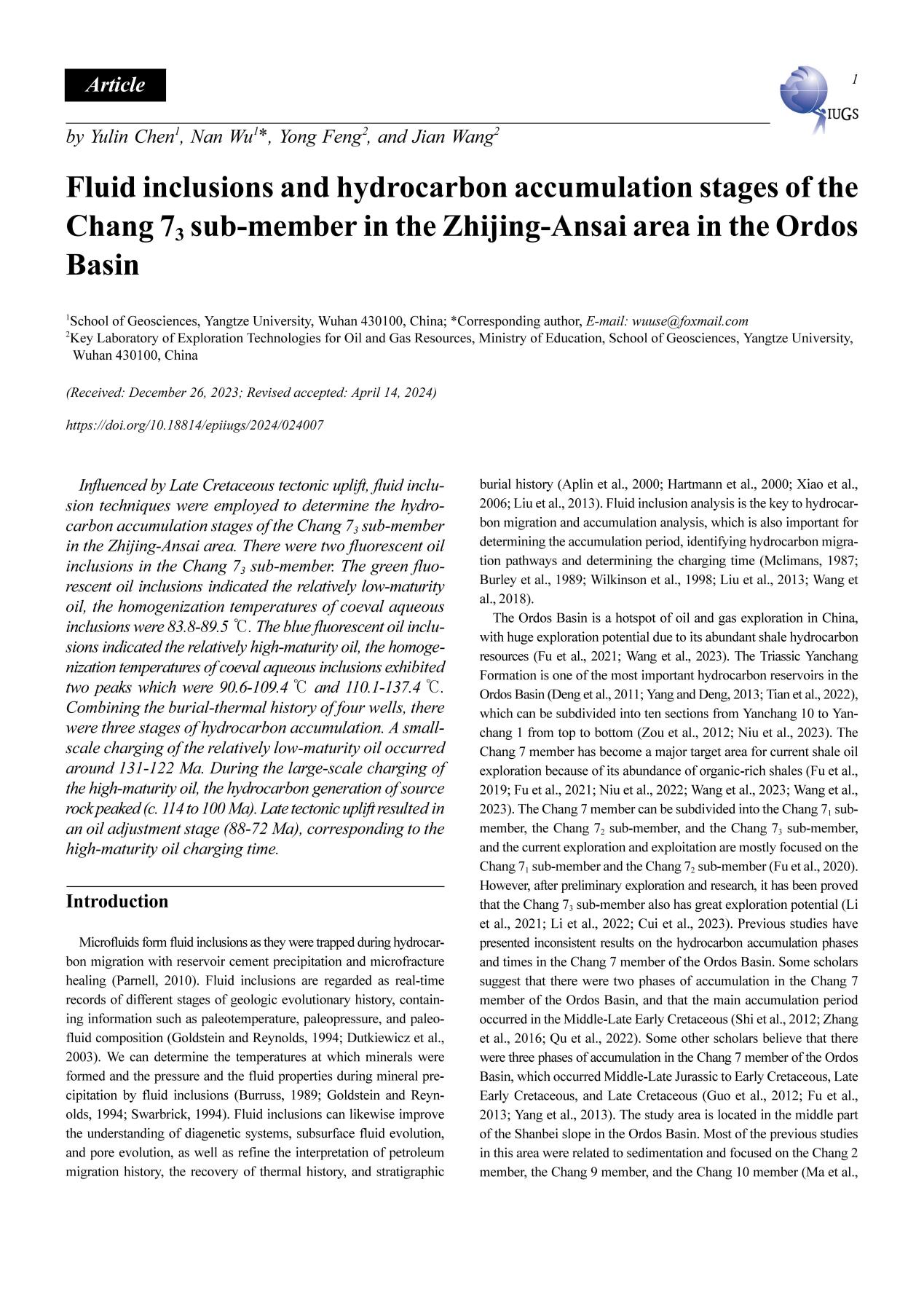 2138cn太阳集团硕士生陈雨霖在《EPISODES》上发表题为“Fluid inclusions and hydrocarbon accumulation stages of the Chang 73 sub-member in the Zhijing-Ansai area in the Ordos Basin”的研究论文。长江大学2138cn太阳集团为论文第一署名单位,硕士生陈雨霖为论文第一作者,教师吴楠为通讯作者。