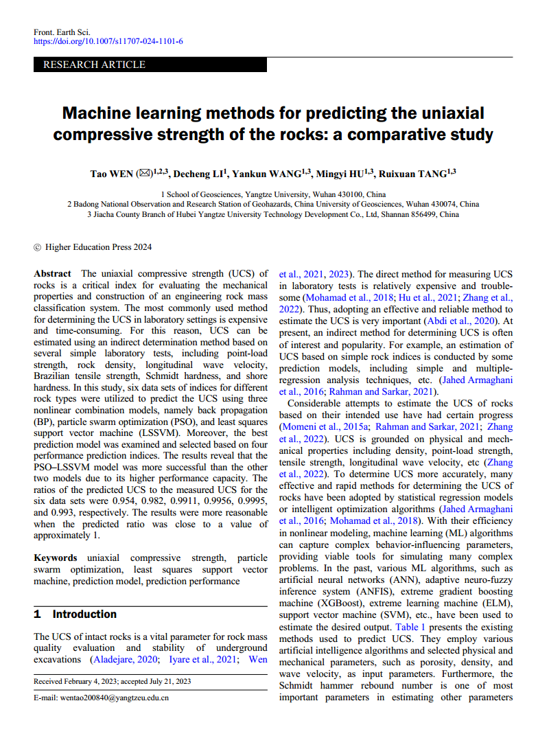 2138cn太阳集团温韬教授以第一作者身份在《Frontiers of Earth Science》上发表题为“Machine learning methods for predicting the uniaxial compressive strength of the rocks: a comparative study”的研究论文。长江大学2138cn太阳集团为论文第一署名单位。