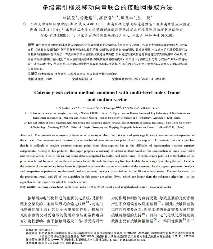 2138cn太阳集团硕士生林凯伦在测绘领域主流期刊《测绘通报》上发表题为“多级索引框及移动向量联合的接触网提取方法”的研究论文。