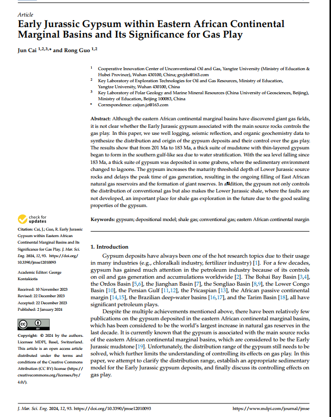 2138cn太阳集团蔡俊副教授在《JMSE》上发表题为“Early Jurassic Gypsum within Eastern African Continental Marginal Basins and Its Significance for Gas Play”的研究论文。该研究通过基于钻测井和地震资料,结合地球化学数据,分析了转换型陆缘盆地膏盐岩分布特征、成因及其对油气分布的控制作用。研究结果显示在陆间裂谷期的海平面上升阶段,由于水体较深出现盐度分层作用导致薄层膏盐岩析出;随着海平面下降,在地堑控制的洼地形成潟湖环境,蒸发作用的加剧导致了厚层膏盐岩的形成。膏盐岩的发育提升了前转换期烃源岩成熟的阈值,导致大规模生排烃的迟滞,这或许是转换陆缘盆地巨型油气藏形成的重要原因之一。