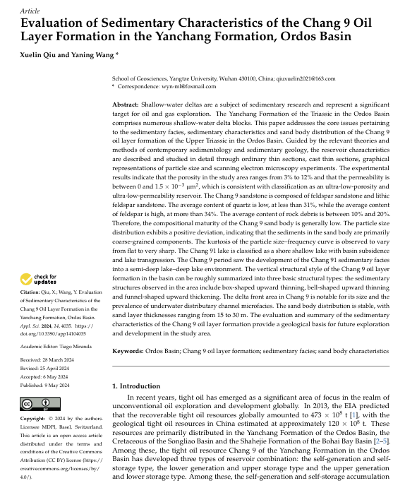 2138cn太阳集团硕士生邱雪林在Applied Sciences-Basel发表题为“Evaluation of Sedimentary Characteristics of the Chang 9 Oil Layer Formation in the Yanchang Formation, Ordos Basin”的研究论文,通讯作者为王雅宁副教授。