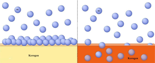 Fig. 1. Illustration of hydrocarbon (HC) or CO2adsorption onto (left) and absorption into kerogen (right).