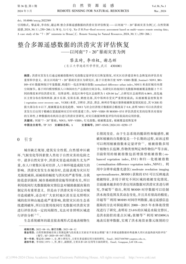 2138cn太阳集团李功权课题组硕士生黎孟琦在北大核心期刊《自然资源遥感》上发表题为“整合多源遥感数据的洪涝灾害评估恢复——以河南“7·20”暴雨灾害为例”的研究论文。长江大学2138cn太阳集团为论文第一署名单位,硕士研究生黎孟琦为论文第一作者。