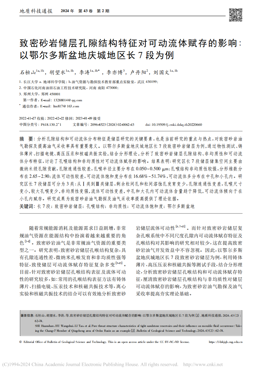 2138cn太阳集团博士生石桓山在期刊《地质科技通报》上发表题为“致密砂岩储层孔隙结构特征对可动流体赋存的影响:以鄂尔多斯盆地庆城地区长7段为例”的研究论文。长江大学2138cn太阳集团为论文第一署名单位,李涛教授为通讯作者。