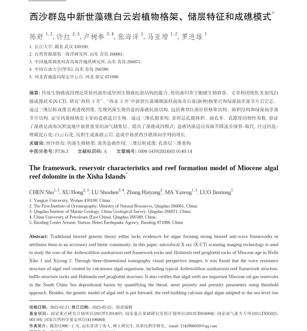 2138cn太阳集团硕士研究生陈舒在《热带海洋学报》期刊上发表题为“西沙群岛中新世藻礁白云岩植物格架、储层特征和成礁模式”的研究论文。该论文利用微焦X射线扫描成像技术(X-CT),研究“西科1井”、“西永2井”中新世红藻珊瑚藻科南海奇石藻(新种)格架岩和绿藻仙掌藻节片岩岩芯。通过三维层析成像直观透视图像,发现钙藻生物营造的藻礁抗浪结构,包括典型红藻柱状格架结构、障积结构和绿藻仙掌藻节片结构,证实钙藻植物是主要的造礁造岩生物。通过三维孔隙重构,获得总孔隙体积、面孔率、孔隙度的物性参数,验证了藻礁是南海沉积盆地中新世重要的油气储集层。提出了藻礁成因模式:造礁钙藻适应海面升降逐步演替–取代,经过钙化–埋藏化石化–白云石化,沉积生成藻礁云岩,造成中新世西沙礁纵向序列的增长。