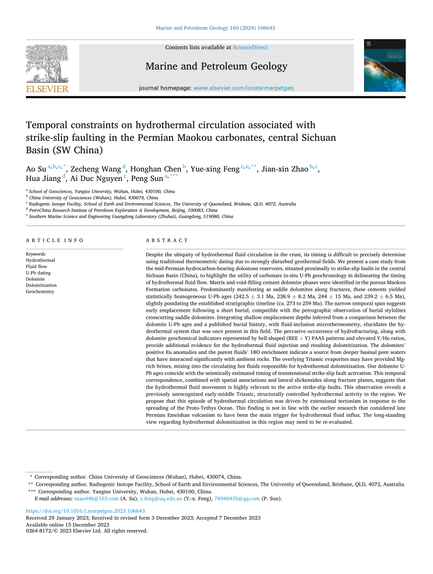 2138cn太阳集团苏奥副教授在《Marine and Petroleum Geology》上发表题为“Temporal constraints on hydrothermal circulation associated with strike-slip faulting in the Permian Maokou carbonates, central Sichuan Basin (SW China)”的研究论文。长江大学2138cn太阳集团为论文第一署名单位。该论文深入探讨了构造活动作用下控制的热液活动模式,对该地区油气优势储层勘探具有一些参考意义。