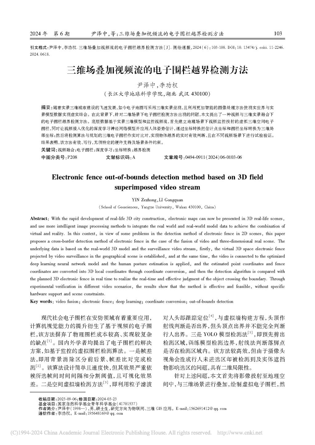 该论文提出了一种视频与三维实景融合下的电子围栏越界检测方法。底层数据基于实景三维模型和监控视频流,首先建立地理场景下视频监控投射的虚拟三维空间电子围栏,同时让视频接入优化的深度学习神经网络模型并应用人体姿势估计,通过坐标转换把估计点坐标和围栏坐标转换为三维局部坐标;然后将检测算法与规划的三维电子围栏作实时比对,实现物体越界的实时有效判断,且在不同视频场景下进行试验验证。结果表明,该方法有效、可行,无须特定的硬件支持及场景条件约束。