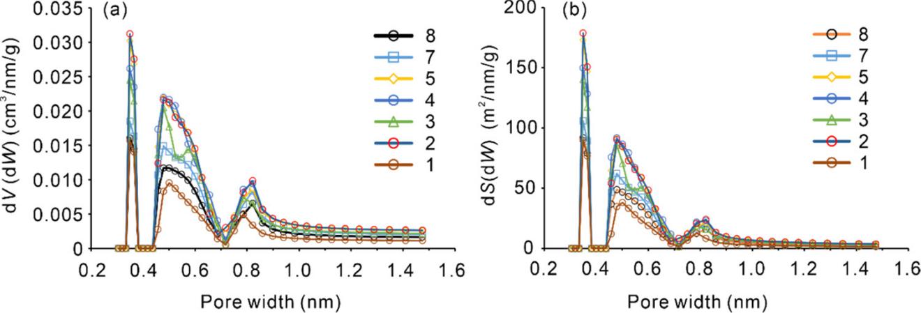 图2 从低压CO2 吸附等温线获得的孔径分布似乎是三峰的,峰位于0.35、0.5和0.8 nm。(a)孔体积分布与孔宽的关系。(b)孔隙SSA分布与孔宽的关系。