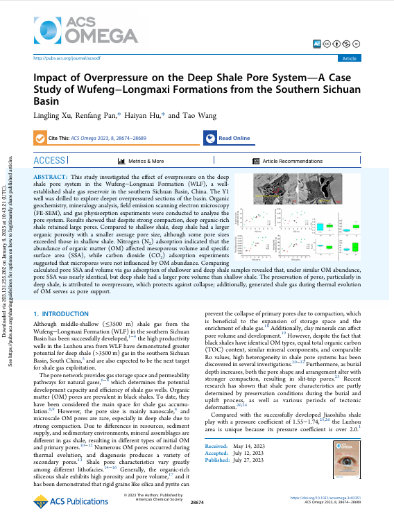 2138cn太阳集团石油系潘仁芳教授在地球化学领域主流期刊《ACS OMEGA》上发表题为“Impact of Over pressure on the Deep Shale Pore System—A Case Study of Wufeng−Longmaxi Formations from the Southern Sichuan Basin”的研究论文。