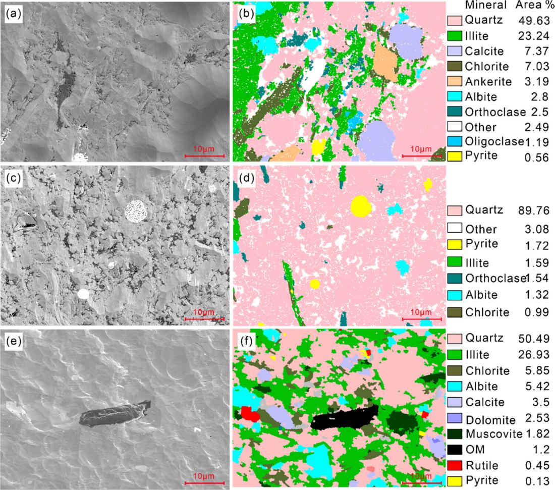 图1 通过AMICS获得的矿物成分和从相应的FE-SEM图像获得的孔隙分布。左:FE-SEM图像。右图:左侧FE-SEM图像中相同样品的矿物成分分布。OM =有机物。(一、二)样品ID = 8,大多数孔隙位于有机物内,然后位于矿物基质之间。(c,d)样品ID = 5,孔隙主要出现在有机物中,然后是石英颗粒的边缘。(e,f)样品ID = 1,观察到很少或没有有机物。