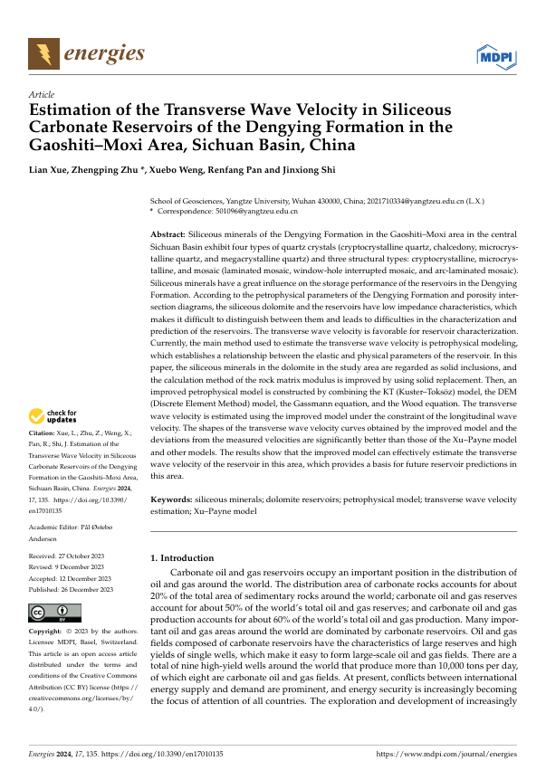 2138cn太阳集团地科系朱正平博士在地质能源领域主流期刊《Energies》上发表题为“Estimation of the Transverse Wave Velocity in Siliceous Carbonate Reservoirs of the Dengying Formation in the Gaoshiti–Moxi Area, Sichuan Basin, China”的研究论文。