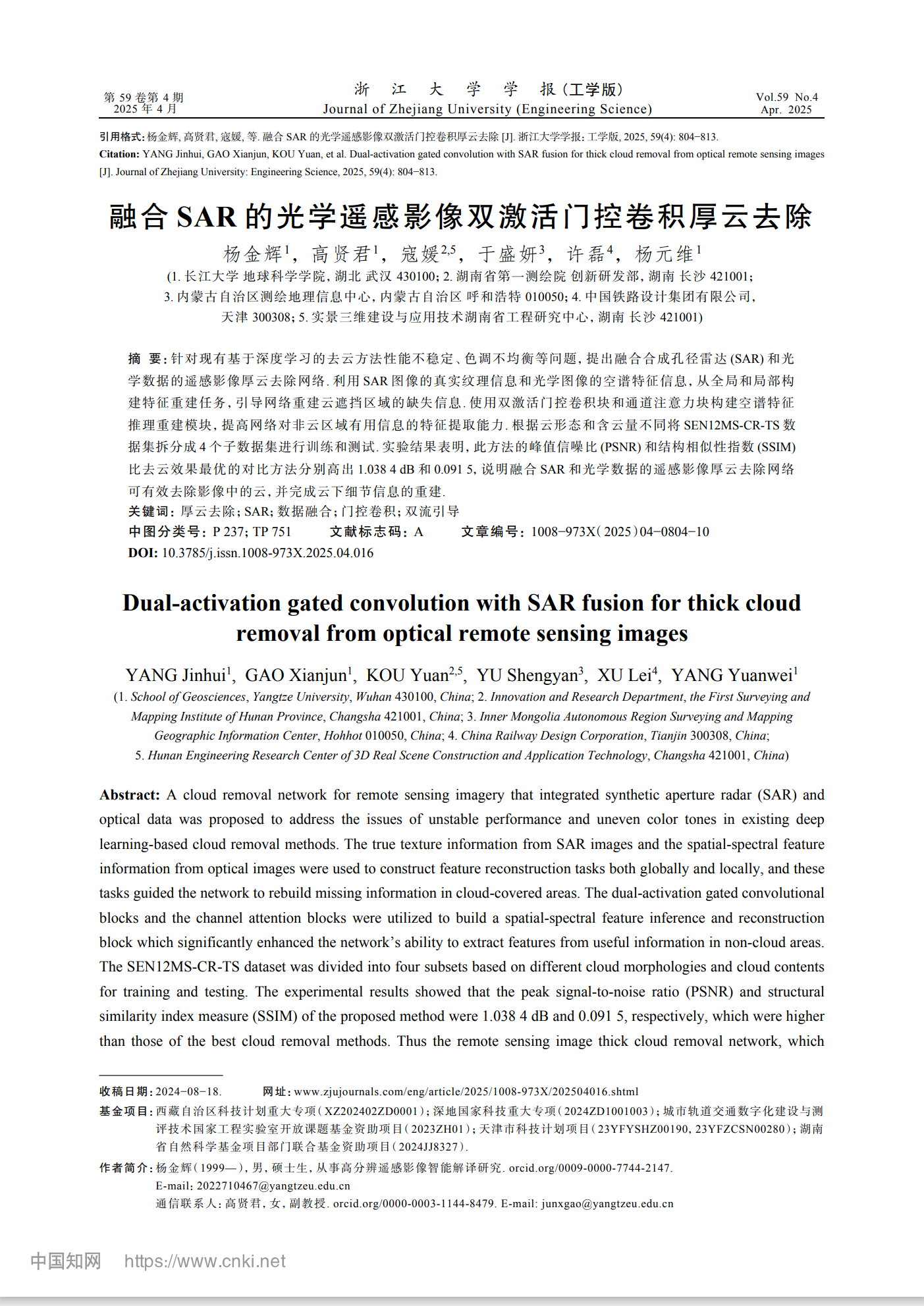近日,2138cn太阳集团地图制图学与地理信息工程专业2022级研究生杨金辉在EI期刊《浙江大学学报(工学版)》发表题为“融合SAR的光学遥感影像双激活门控卷积厚云去除”的研究论文。长江大学2138cn太阳集团为论文第一署名单位,学生杨金辉为论文第一作者,其导师高贤君副教授为通讯作者。