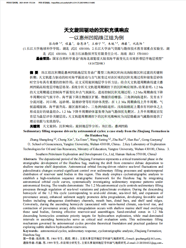 2138cn太阳集团张尚锋教授在《断块油气田》上发表题为“天文旋回驱动的沉积充填响应—以惠州凹陷珠江组为例”的研究论文。长江大学2138cn太阳集团为论文第一署名单位,张尚锋教授为论文第一作者,硕士生程鑫为该文通讯作者。该项研究得到国家自然科学基金“南海北部宽缓大陆架海平面变化及双坡折带层序地层模型”的资助。