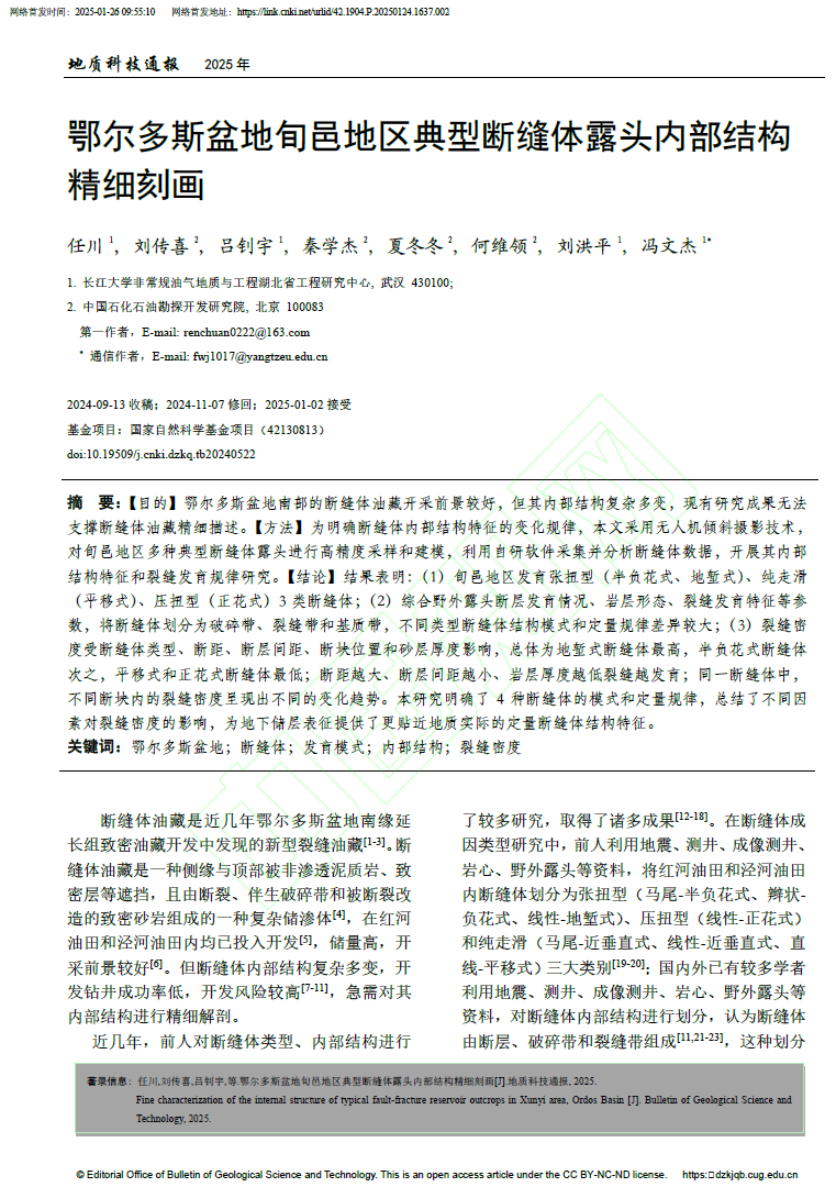 2138cn太阳集团研究生任川在期刊《地质科技通报》上发表题为“鄂尔多斯盆地旬邑地区典型断缝体露头内部结构精细刻画”的研究论文。长江大学非常规油气地质与工程湖北省工程研究中心为论文第一署名单位,冯文杰副教授为通讯作者。