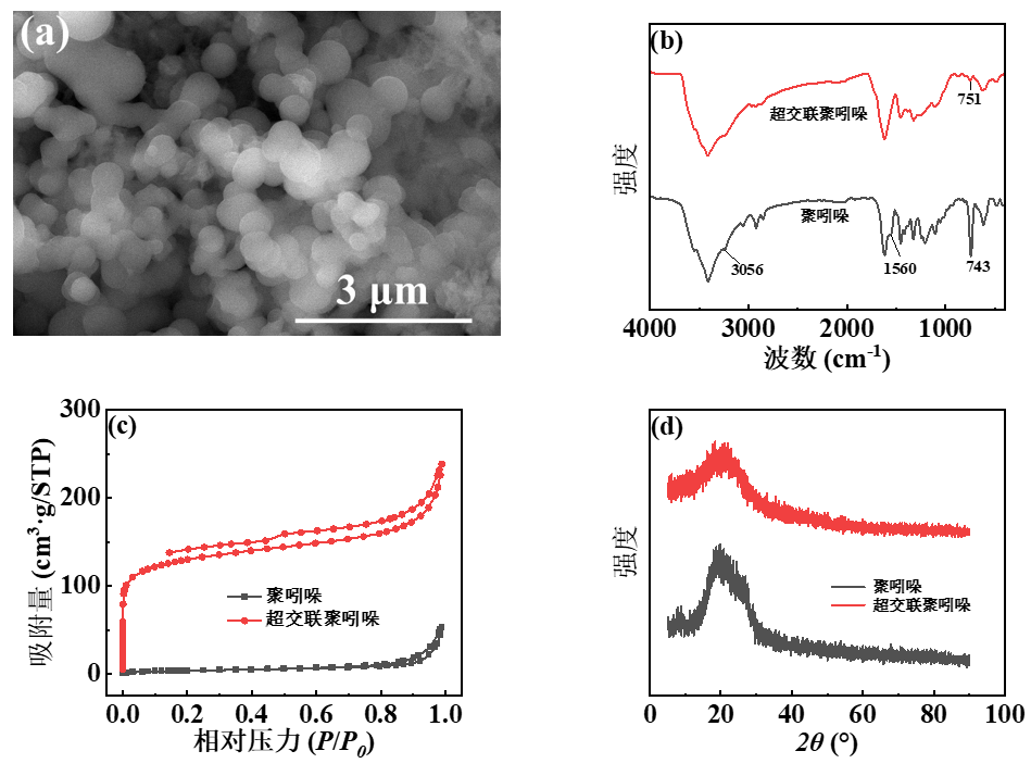 图2(a)超交联聚吲哚的SEM图,聚吲哚与超交联聚吲哚的(b)FT-IR谱图(c)N2吸脱附曲线(d)XRD谱线