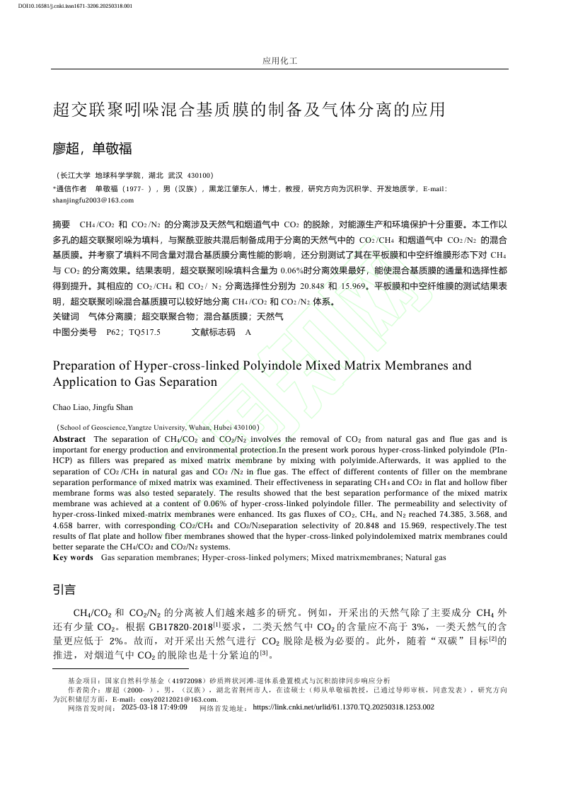 近日,2138cn太阳集团硕士生廖超在中文核心期刊《应用化工》上发表题为“超交联聚吲哚混合基质膜的制备及气体分离的应用”的研究论文。该论文以多孔的超交联聚吲哚为填料,与聚酰亚胺共混后制备成用于分离的天然气中的CO2/CH4和烟道气中CO2/N2的混合基质膜。长江大学2138cn太阳集团为论文第一署名单位,硕士生廖超为论文第一作者。