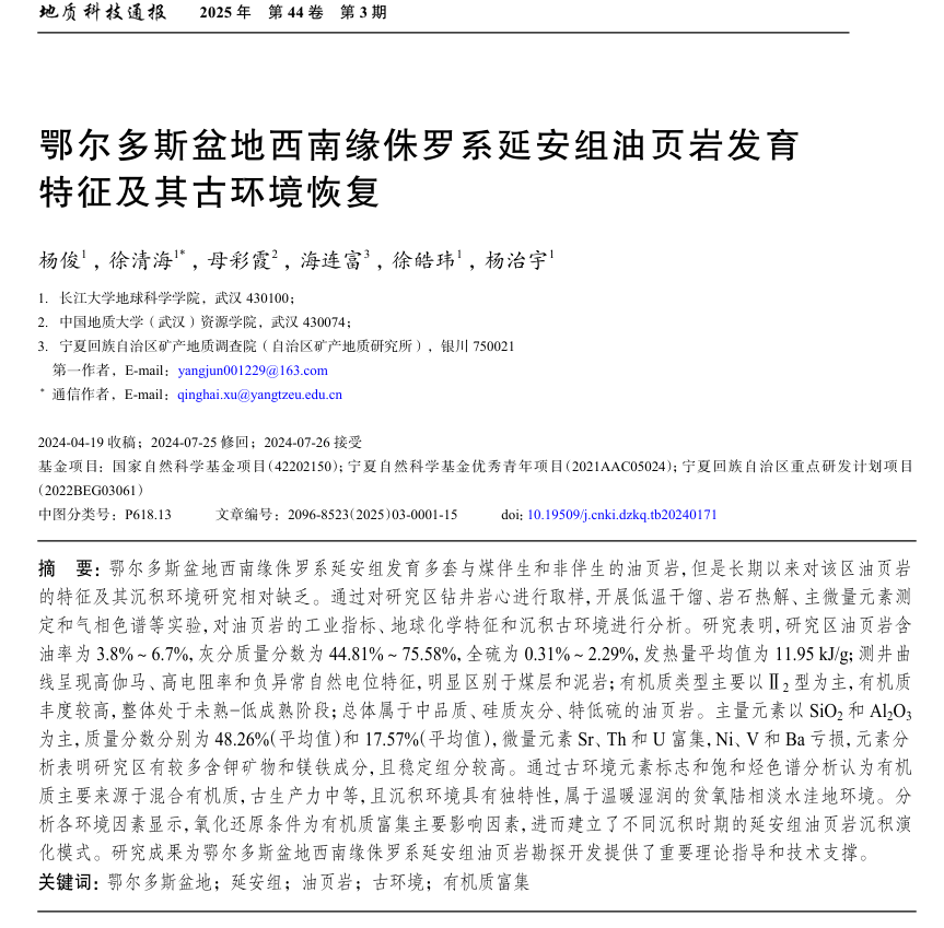 2138cn太阳集团硕士生杨俊在期刊《地质科技通报》上发表题为“鄂尔多斯盆地西南缘侏罗系延安组油页岩发育特征及其古环境恢复”的研究论文。长江大学2138cn太阳集团为论文第一署名单位,徐清海副教授为通讯作者。