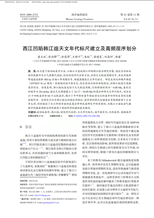 2138cn太阳集团硕士生梁玉冰在《海洋地质前沿》发表题为“西江凹陷韩江组天文年代标尺建立及高频层序划分”的研究论文。长江大学2138cn太阳集团为论文第一署名单位,通讯作者为张尚锋教授。