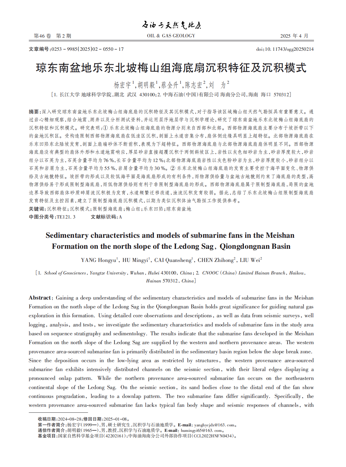 2138cn太阳集团研究生杨宏宇以第一作者身份在北大核心期刊(EI)《石油与天然气地质》上发表题为“琼东南盆地乐东北坡梅山组海底扇沉积特征及沉积模式”的研究论文,长江大学2138cn太阳集团为论文第一署名单位,导师胡明毅教授为通讯作者。